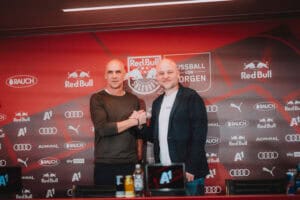 Thomas Letsch und Rouven Schroeder freuen sich auf die Zusammenarbeit. (c) Andreas Schaad – FC Red Bull Salzburg