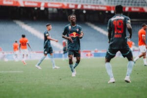 Karim Konate jubelt nach seinem Tor gegen Sheffield Wednesday mit Dorgeles Nene. (c) Andreas Schaad – FC Red Bull Salzburg